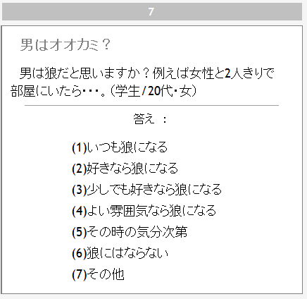 「女と男の辞典」というアンケートサイトがある。 そこに、こんなアンケートがあった。 89%の人が女性と2人きりなったら、狼になると答えている。 ま、アンケートに答えた人の中の数字だから、あてにならないけどね。 だって、うそつきが答えてないよね。 うそつきは、かならずいるものだからね。