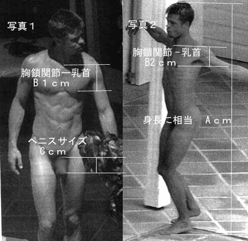 ブラピの身長は183cmだから、ペニス平常時サイズは10.5cmとなりました。彼の名誉のために一言付け加えるならば、ペニスは斜めから撮影されている。おそらく30度くらいの角度がついているものと思われる。とすると、14.5cmくらいが正確な長さであろう。ちなみに、写真2の身長が低めに測定されていることが問題点としてあるが、もし正確に身長が測定できていたら、ペニスはより短くなってしまうのである。結論としては、10.5から14.5cmがブラピのペニス平常時サイズである。