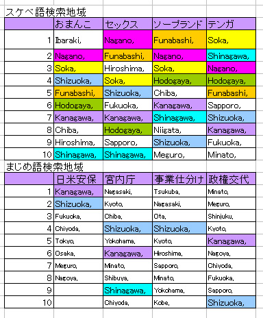 この結果を見ていただければ、用語によってまったく検索している地域が異なるのは明白である。